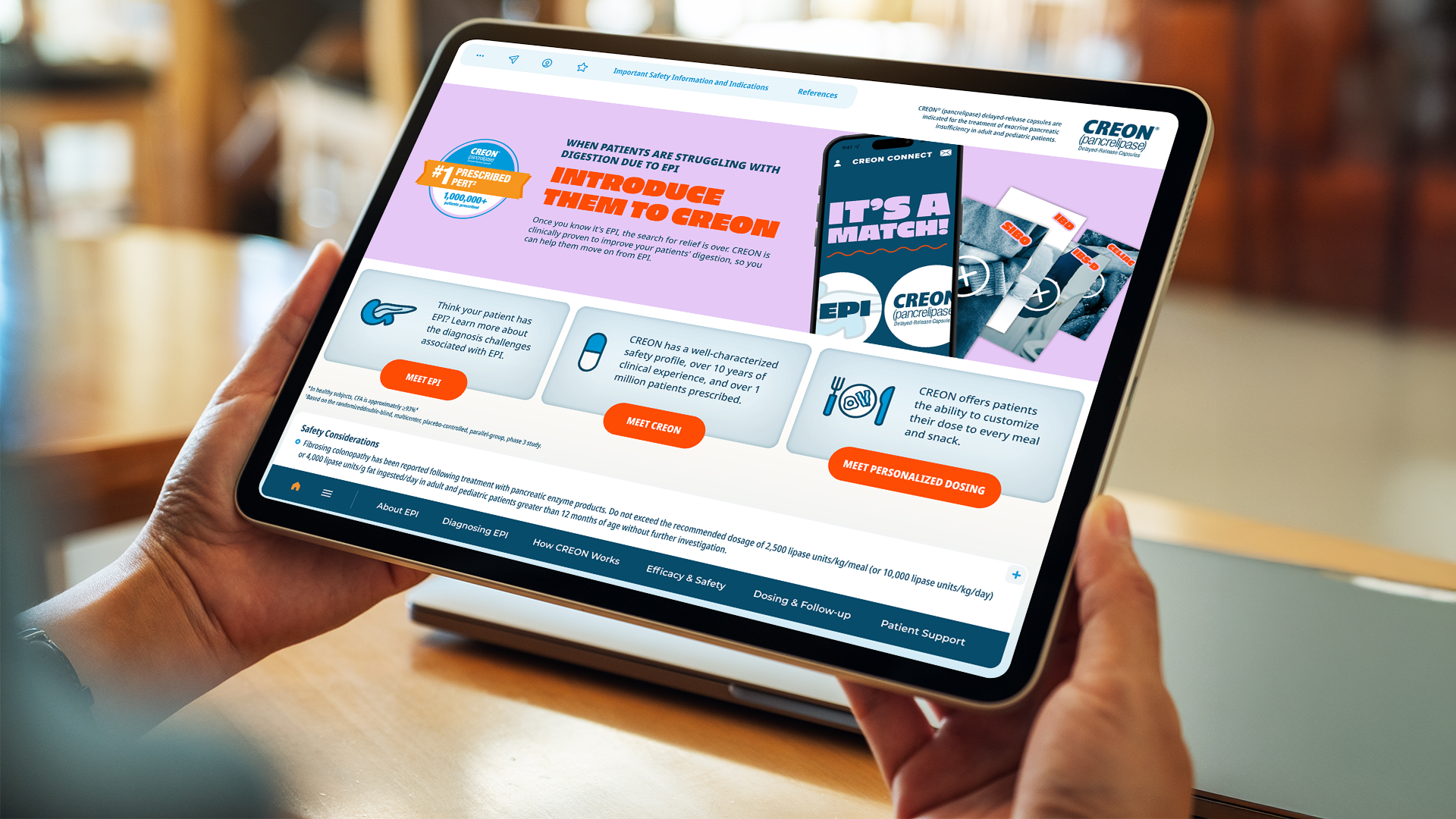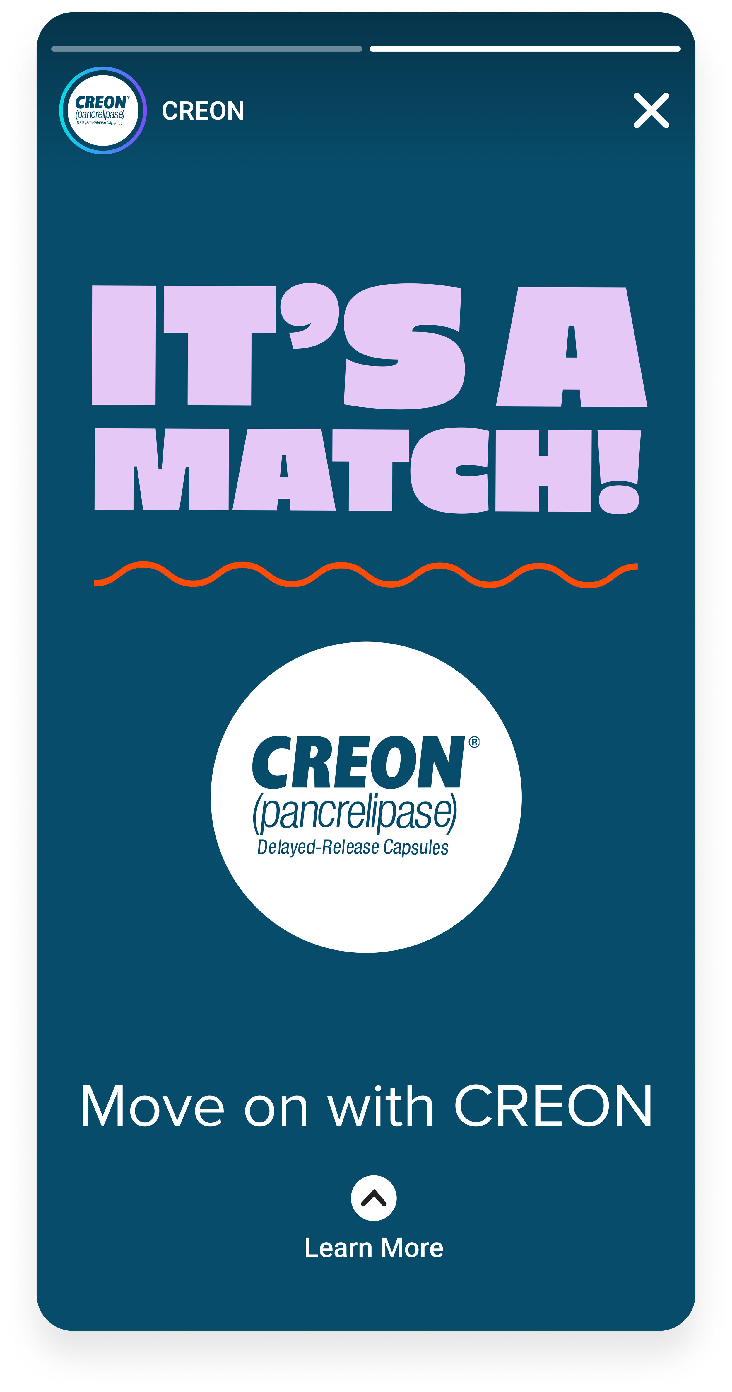 As a Pancreatic Enzyme Replacement Therapy (PERT), CREON becomes the "PERTfect Match" for patients who’ve struggled with ineffective treatments. The campaign playfully reimagines a dating app experience, using familiar terms like “swiping right” and “matching” to connect patients with their ideal therapy.
